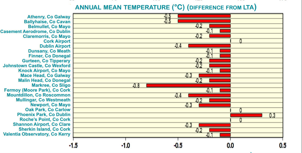 A few other stations, mainly located in the Midlands and West, reported their lowest annual mean temperatures since 2010 - Met Eireann