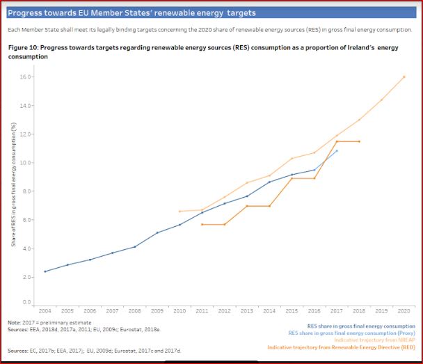 So Ireland in 2017 was 10.8% (they squeezed a bit more!) but versus 11.9% in NREAP Trajectory. In 2016 it was 9.5% versus 10.7%. Bottom line, they should be doing a new NREAP with proper SEA, etc., as the graph below shows they have been below the target now for several years and not getting any nearer to catching up with it. So where is that legally required new NREAP? There is no point in threatening us the public with fines, when the reason they are in a mess is a failure to properly comply with the law and come up with something, which wasn't so dysfunctional.