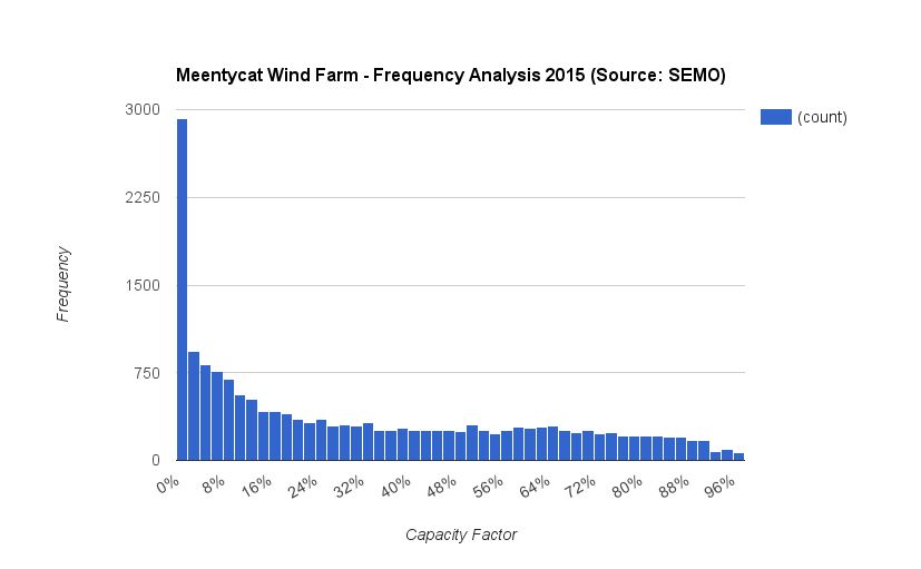 Another way of looking at these figures is that for around a third of the time, the wind farm operated at between 26% and 74% of its max output, equivalent to the same amount of time it operated at less than 10% capacity factor. So there is an equal chance that the wind farm will generate mid range amounts of power as it will tiny amounts. There is greater chance (18%) that it will generate none or next to no power as it will very high amounts of power (10.5%).