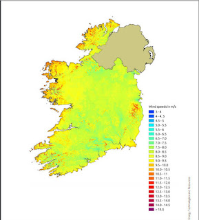 If there is a case for wind farms in Ireland, then it's within that dark blue line only in the map above and should have been restricted to around 1,100MW. The wind industry and government are fond of telling us that "Ireland has the best wind resource in Europe" but actually that only applies to a small portion of the island and is comparative to Scotland and North Denmark.
